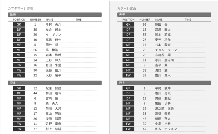 ホームの讃岐は勝利した前節と同じスタメンでスタート。