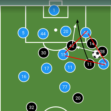 選手同士の間(赤線内)にスッとポジションを取りプレッシャーを交わしゲームメイクするチョンウヨン選手の存在感は別格で右へ左へ、果てはダイレクトに裏を狙うなど多彩に配球。