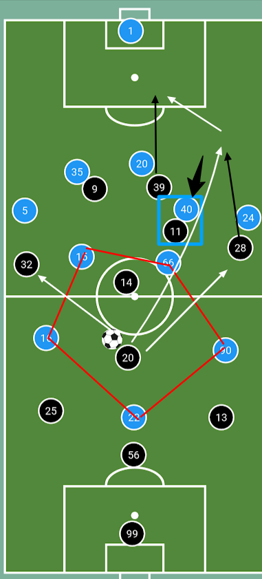 反作用で穴が開くスペース(赤線内)に人数を集められ局面で数的優位を生み出す富山の連携に崩され傷口が広がり苦し紛れのシステム変更でも止められず万事休す。 |
