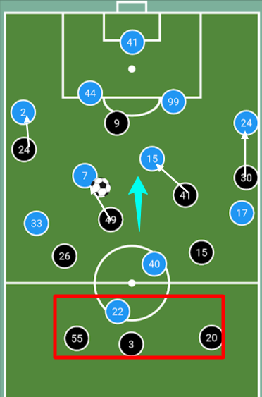 金沢は3バック(赤枠)残し積極的なプレスを仕掛ける守備(矢印)に気圧され