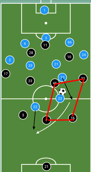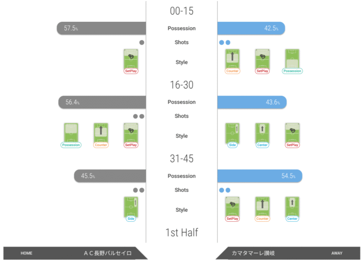 讃岐の後方に対し同数でプレスを狙う長野(青枠)