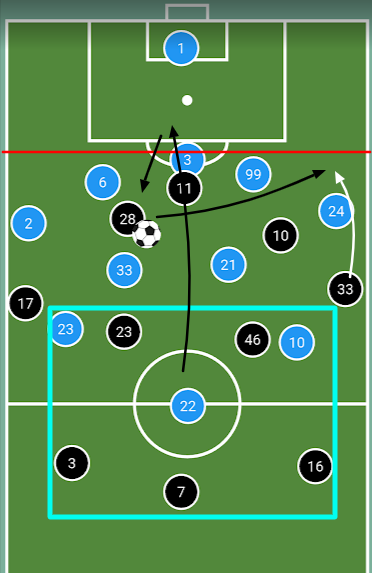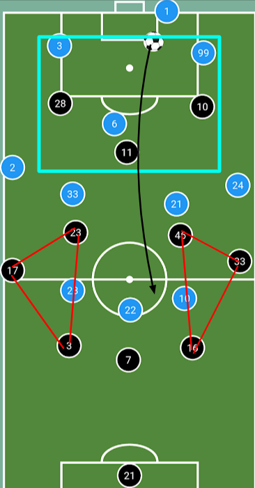 ディフェンスラインの背後(赤線奥)狙いが攻撃の基本線。